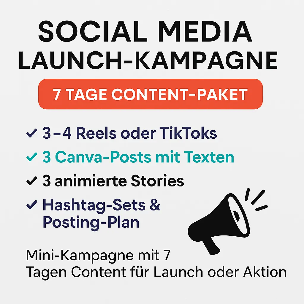 Du planst einen schnellen Produkt- oder Angebotslaunch? Dann ist dieses 7-Tage Launch-Kampagnenpaket genau richtig. Es liefert dir alle Inhalte für einen kompakten, wirkungsvollen Social Media Auftritt – professionell geplant & erstellt.